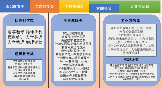 本专业毕业生将具备数学、自然科学、计算机科学等基础知识和大数据工程专业知识,能够在互联网企业、金融机构、科研院所、高等院校、政府机构等企事业单位从事大数据分析、挖掘、处理、服务、应用和研究以及软件开发等工作,或继续在高等院校及科研院所攻读数学、计算机科学、大数据和人工智能等方向研究生。