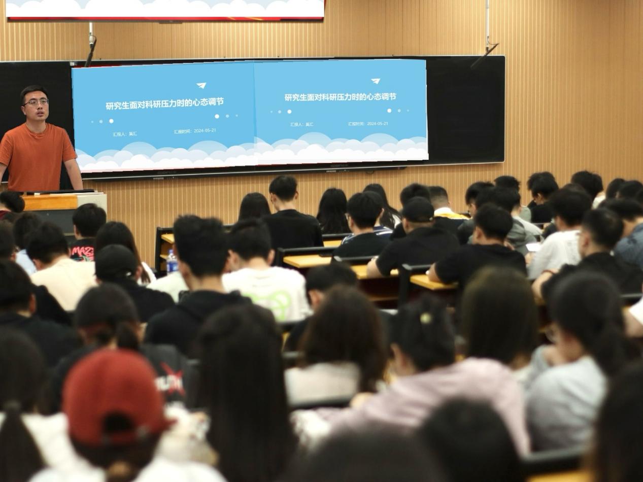 奚汇老师为全体研究生开展主题为“研究生面对科研压力时的心态调节”的心理健康教育讲座。讲座通过压力来源剖析,引导同学们正确认知压力,合理评估压力,积极面对压力。奚汇老师会上也讲解了心理疾病自测标准,出现压力过大甚至心理健康问题时,引导员工学会自我调控,需求支持与建立社交网络,培养兴趣爱好,加强体育运动,帮助员工建立多渠道压力缓解方式,促进员工不断提高自我进步的内驱力。